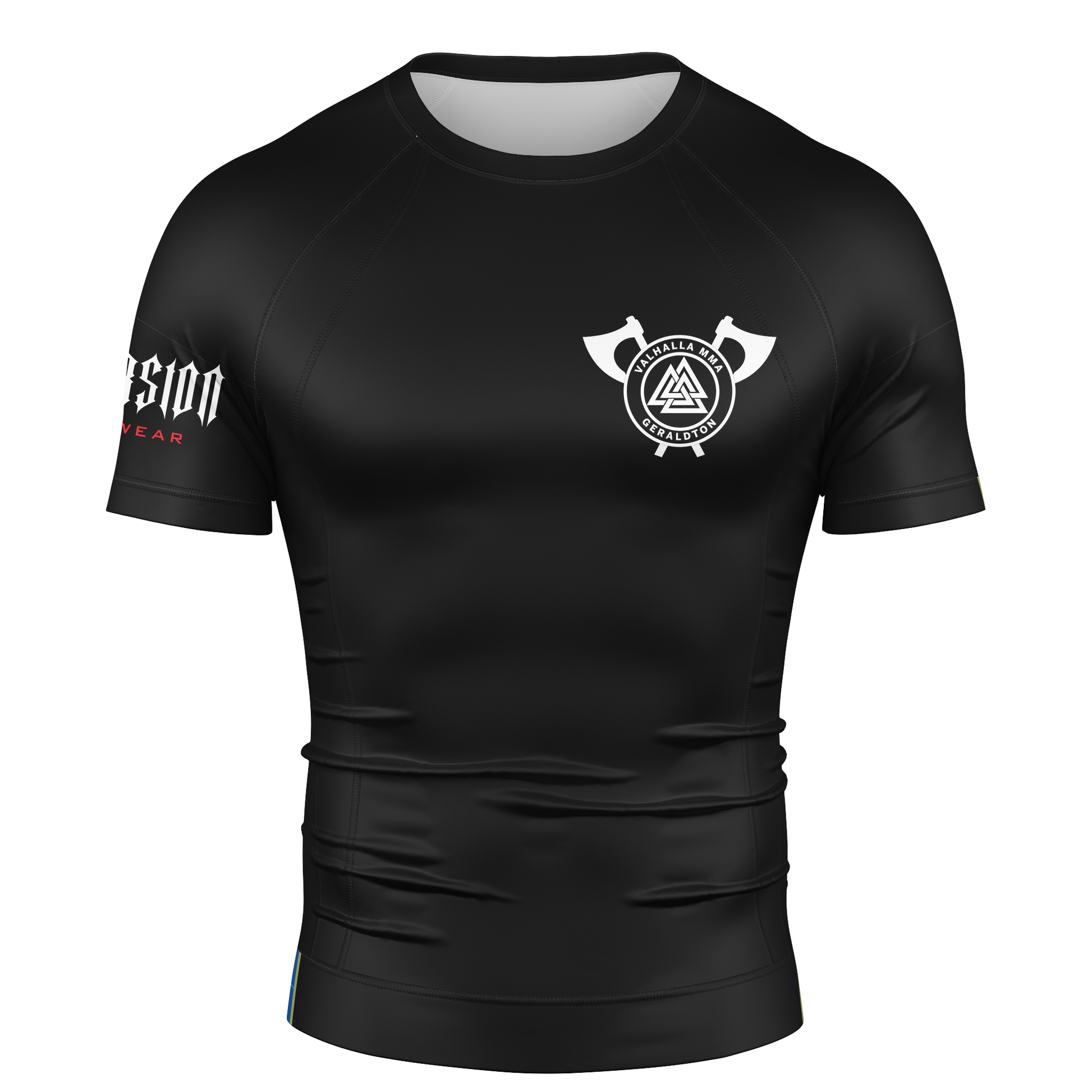 Forge your skills with the Valhalla MMA x Inversion Fightwear Rash Guard, inspired by the Viking spirit of strength and endurance. This custom black performance rash guard features the Valhalla MMA Geraldton crest twin axes and runic emblem representing courage and unity both on and off the mats.